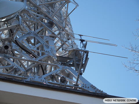 受信アンテナを撮影してみました。以前はこの位置に放送大学FMの受信リングアンテナ×4が取り付けられていましたが、放送終了に伴い地上部分にあったNHK-FMの予備用受信アンテナが取り付けられました。以前の基台と微妙に角度が異なるのが気になるところです。 |