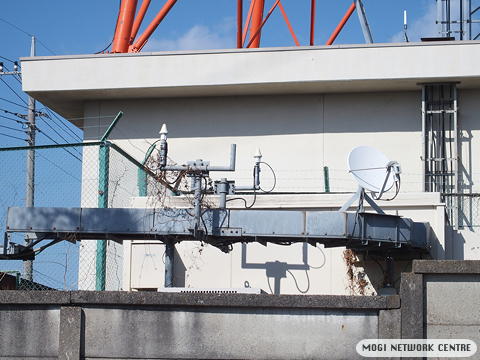 アンテナ部分を撮影してみました。わかりにくいですが、GPS×2もあります(280MHz帯デジタル同報無線システムに関係したものなのでしょうか?)。また、一番下にかすかに見えるパラボラアンテナは、このシステムに関連したものと思われます(JCSAT-2B向けと推測)。 |